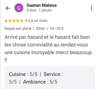 Une carte variée, des produits travaillés avec talent et créativité, un soin particulier apporté au dressage, le tout accompagné du sourire du Chef, dans une ambiance conviviale et décontractée.